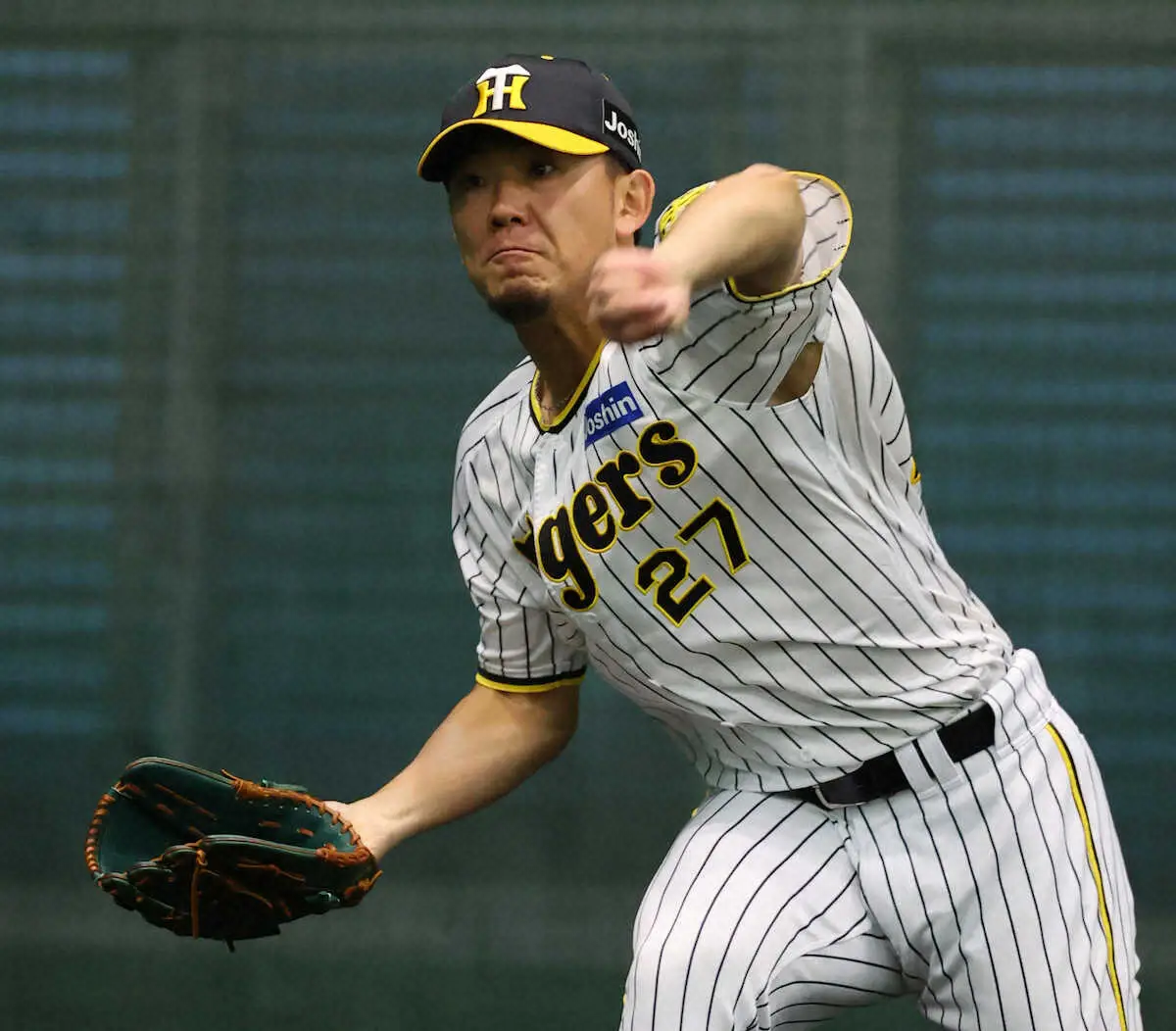 ブルペンで投げ込む阪神・伊藤将(撮影・岸 良祐)