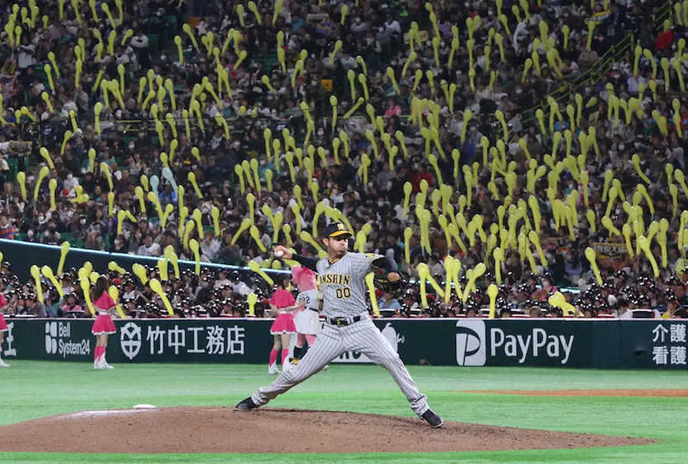 <ソ・神>7回、ソフトバンクファンのジェット風船がスタンドに林立する中、マウンドに立つ阪神・ゲラ(撮影・北條 貴史)