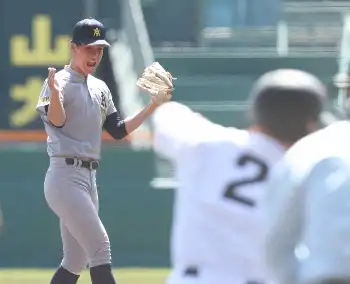 <青森山田・広陵>5回2死一、三塁、只石(手前)を空振り三振に仕留めて雄叫びを上げる青森山田・関(撮影・北條 貴史)