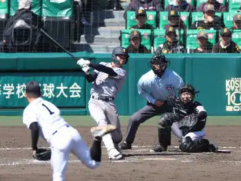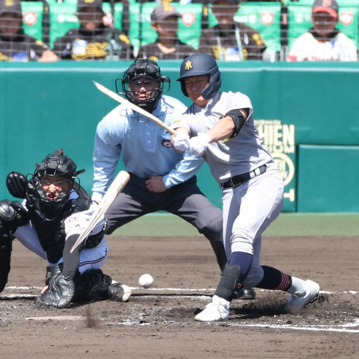 <青森山田・広陵>4回、木製バットが折れる青森山田・対馬(撮影・平嶋 理子)