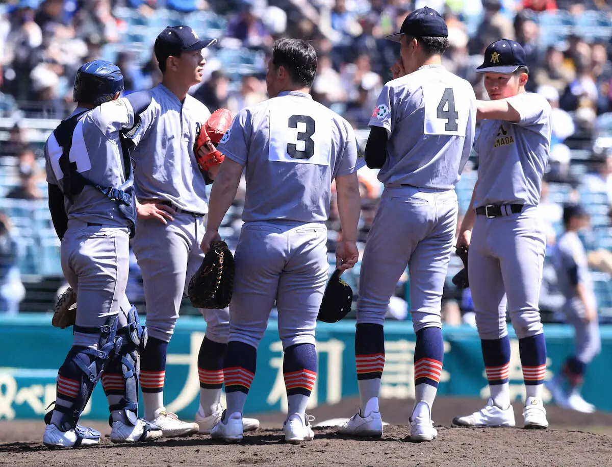 <青森山田・広陵>3回、マウンドで話し合う青森山田ナイン(撮影・中辻 颯太)