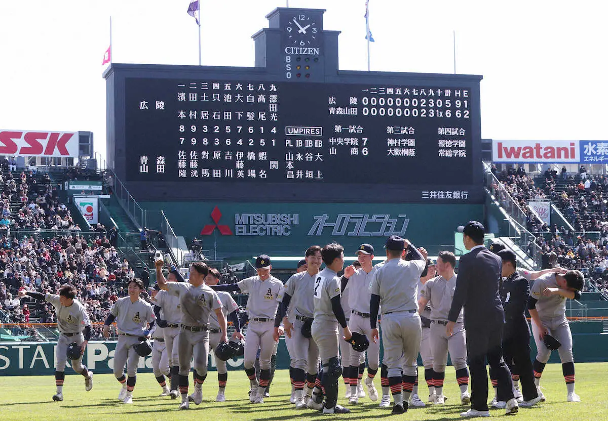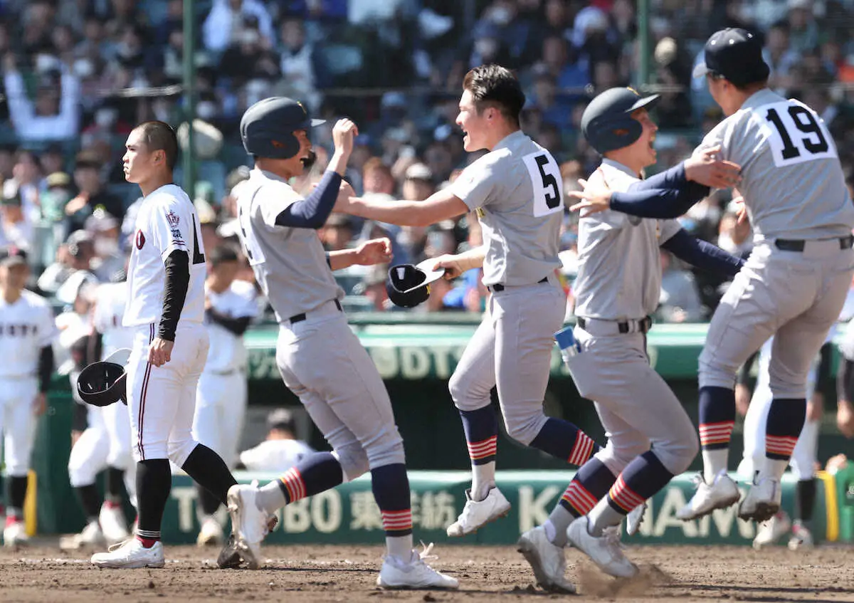 センバツ高校野球8日目<青森山田・広陵>10回、サヨナラ勝ちにわく青森山田ナインとぼう然の広陵・高尾(左)(撮影・北條 貴史)