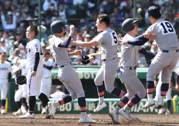 センバツ高校野球8日目<青森山田・広陵>驚異の粘りを見せてサヨナラ勝ちし、歓喜の青森山田ナイン(撮影・北條 貴史)