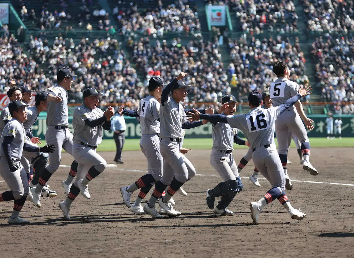 センバツ高校野球8日目<青森山田・広陵>驚異の粘りを見せてサヨナラ勝ちし、歓喜の青森山田ナイン(撮影・北條 貴史)