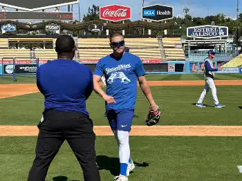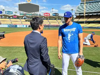 日本ハム時代の先輩でNHKの解説者として現地を訪れている田中賢介氏と旧交を温める大谷 Photo by スポニチ 大谷&ドジャースナインが「ドラゴンボール」Tシャツで練習参加!胸には「… ギャラリーで見る この記事のフォト 2024年03月30日の画像一覧 もっと見る 2024年03月30日の画像をもっと見る