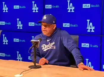 試合前に取材対応を行うドジャース・ロバーツ監督(撮影・杉浦大介通信員)