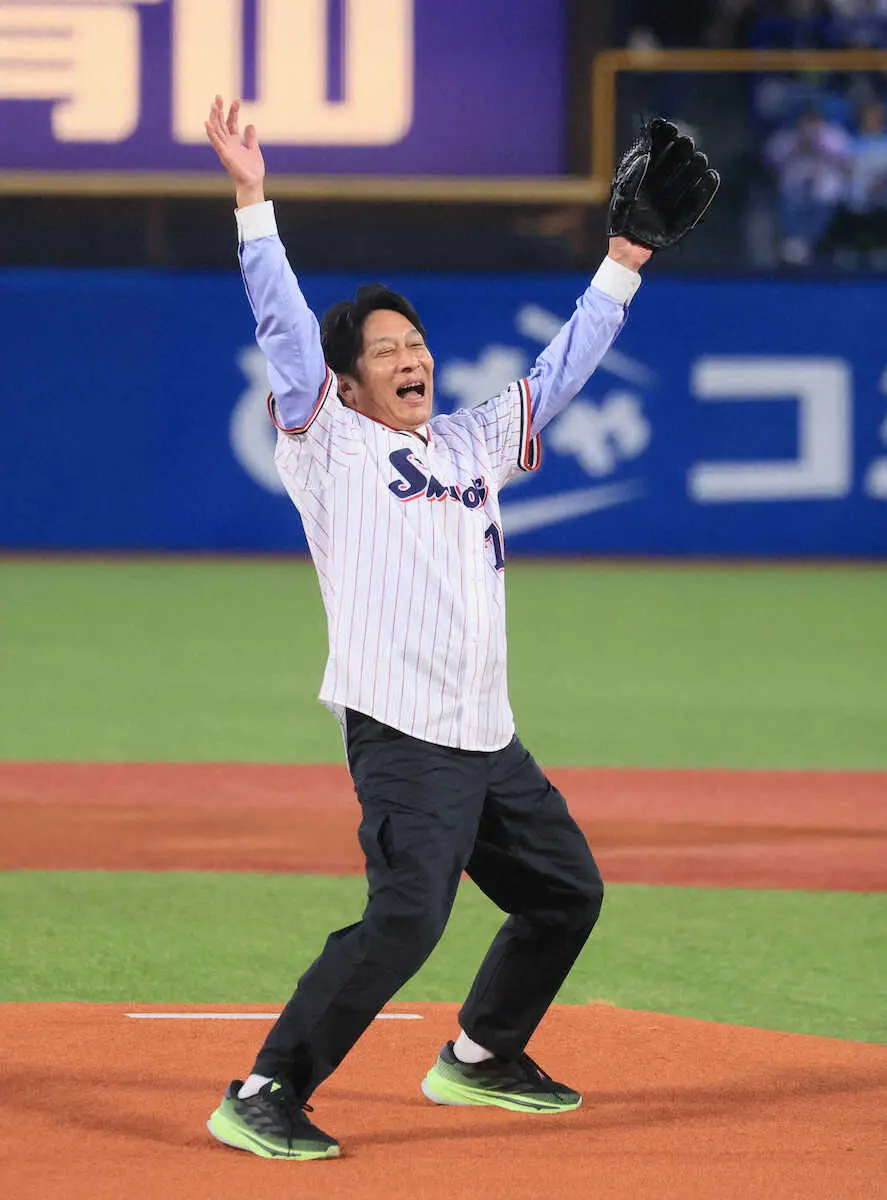 1月の箱根駅伝で7度目の総合優勝に導いた名将はヤクルトの背番号「7」のユニホーム姿で登場。投球はワンバウンドで左打者の背中を通過する“大暴投”になり「“原監督・150キロ剛速球大作戦”でいこうと思ってたんですけど、あんな球になっちゃって恥ずかしい」と苦笑い。