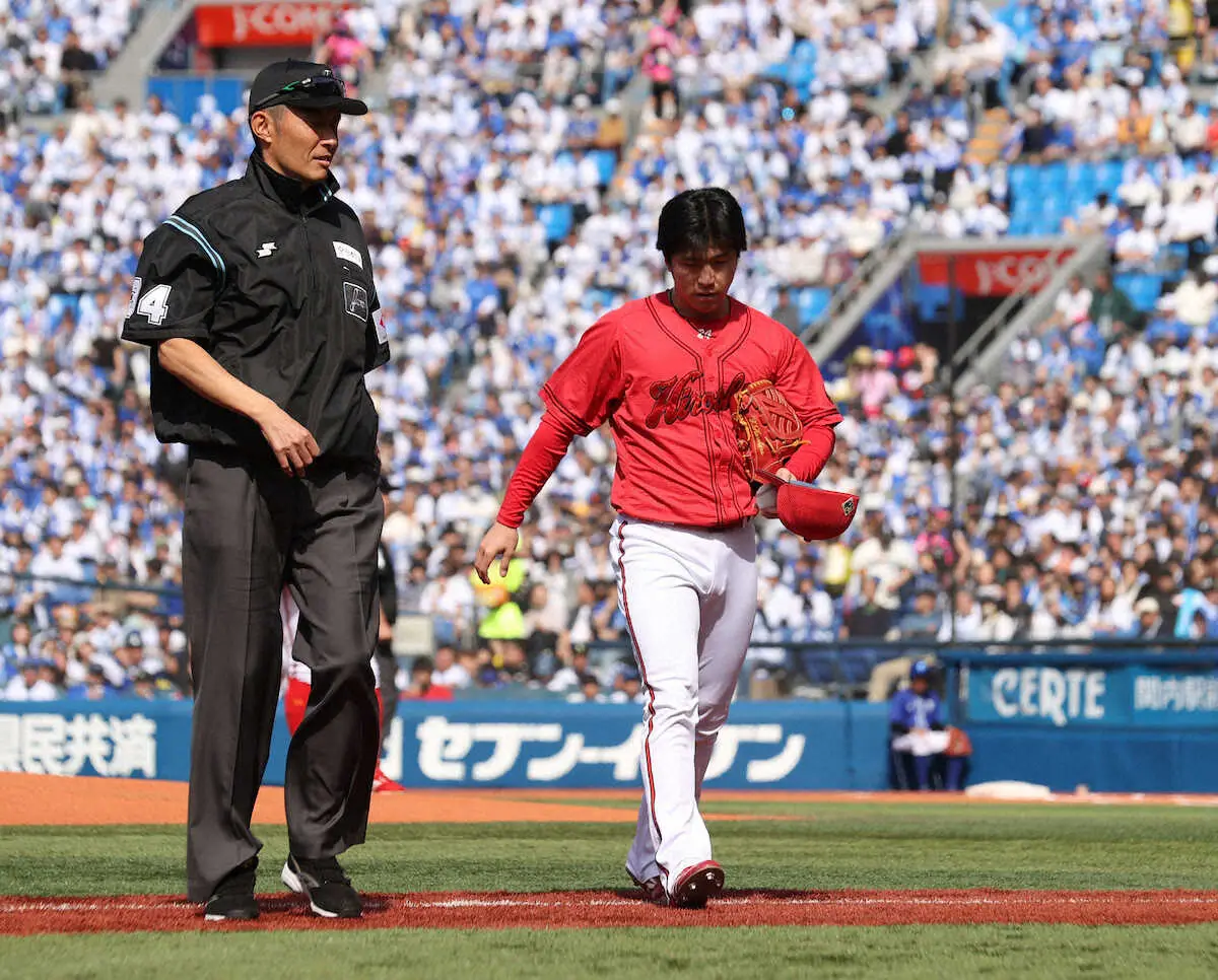 広島・黒原が、わずか3球で危険球退場となった。初回先頭の度会との対戦でカウント1―1からの直球が右頬付近に直撃。球審の山口が「ただいまの投球を危険球と判定し退場といたします」と場内にアナウンス。試合開始直後のアクシデントに球場はどよめきに包まれた。