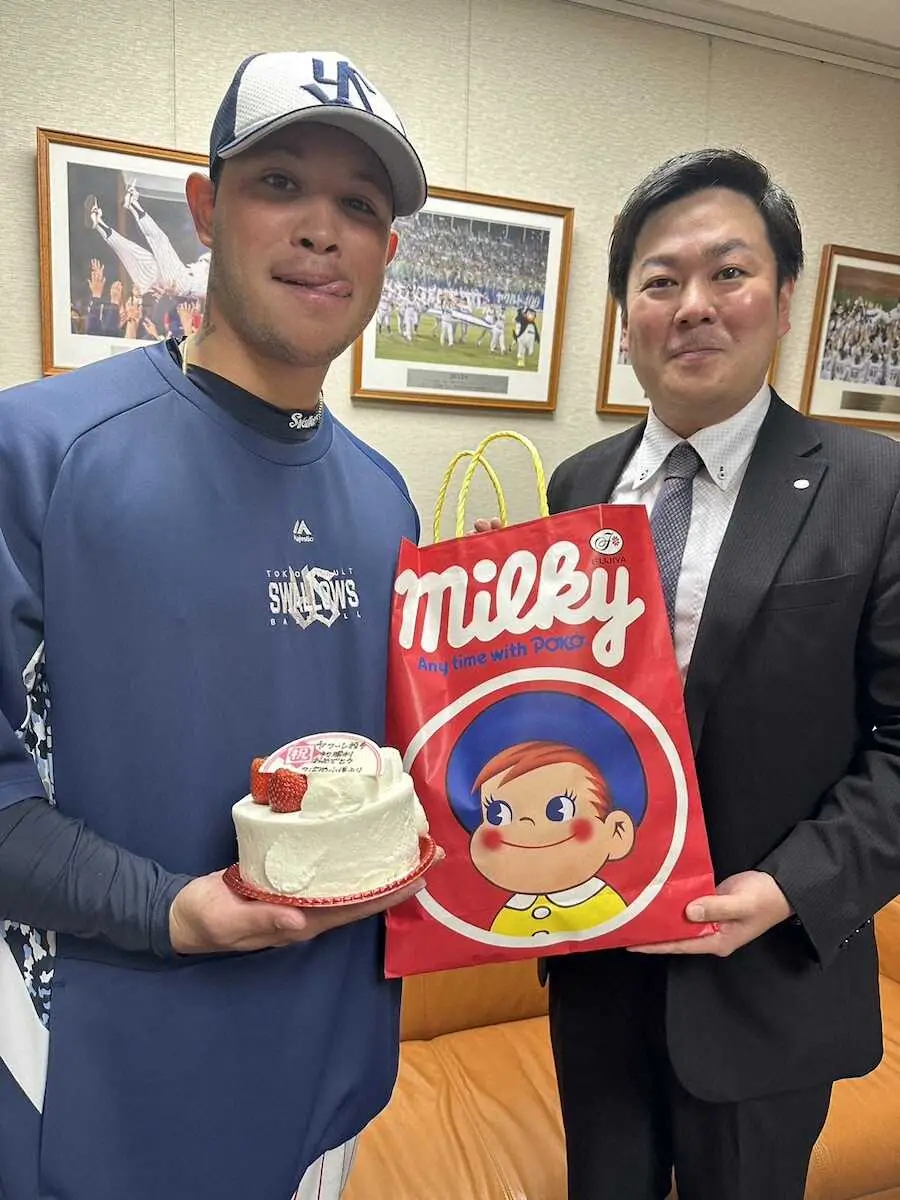 ヤクルト・ヤフーレが来日初先発初勝利から一夜明けた1日、神宮球場クラブハウスで大手菓子メーカー「不二家」からお祝いのケーキを贈呈された。
