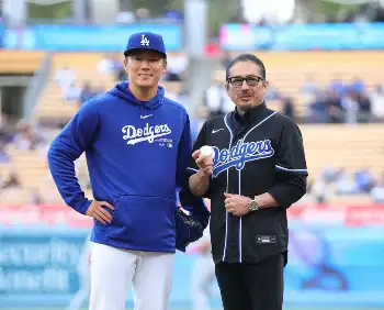 真田広之 ドジャース戦でノーバン始球式 由伸が捕手役