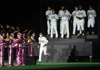 セレモニーを盛り上げるテーマは「タイムトリップ」だった。米人気映画「BACK TO THE FUTURE(バック・トゥ・ザ・フューチャー」でおなじみのBGMが爆音で流れると右翼スタンド後方から劇中でおなじみのタイムマシン改造車のデロリアン、かと思いきや、白いリムジンが球場に入った。車内から指揮官が降り立つと一塁まで敷かれたレッドカーペットの上を、ランニングし選手らとハイタッチをして帽子を取って挨拶した。