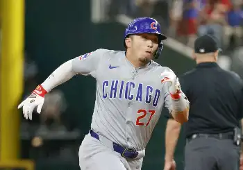 レンジャーズ戦の9回、ベリンジャーの適時打で二塁を回るカブス一走の鈴木