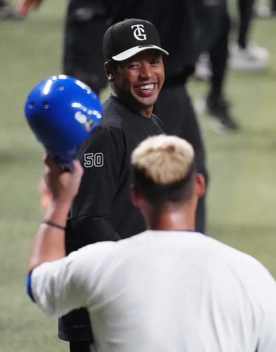 <中・巨>中田(手前)と談笑するオコエ(撮影・木村 揚輔)