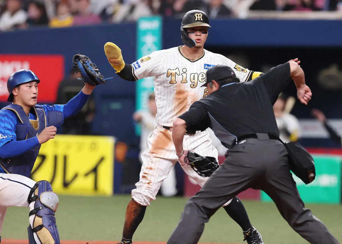 【亀山つとむ 視点】打順が下がっても、ひたむきにプレーする阪神・佐藤輝の姿勢が審判の判定を2度も覆した。梅野の適時打で一塁から三塁へ。木浪の一ゴロでは本塁へ突入。いずれもアウトとコールされながら、リプレー検証でセーフに変わった。タイミングは本当に紙一重。スピードを緩めたら、ジャッジは変わらなかった。