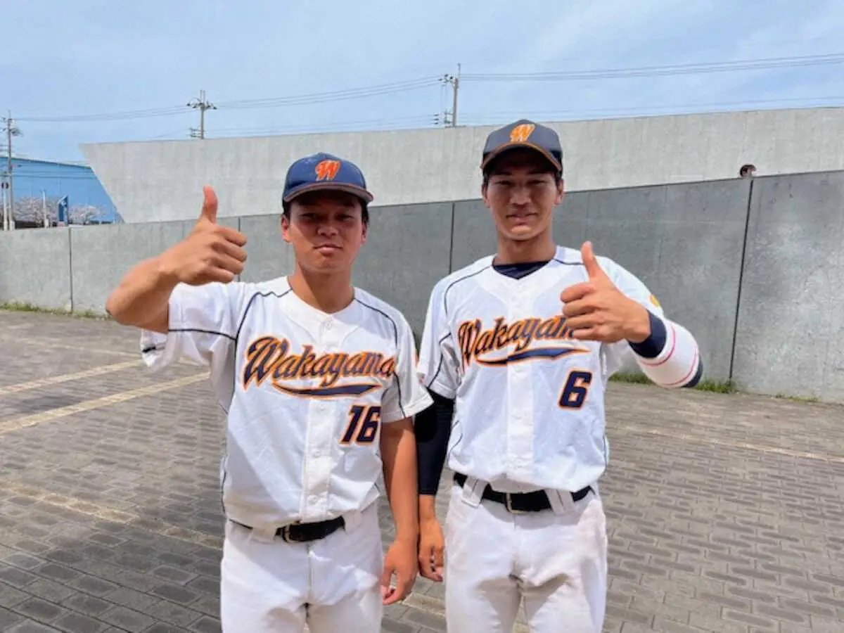 <和歌山大ー神戸医療未来大>完投勝利を収めた和歌山大の島(左)と決勝アーチを放った吉村