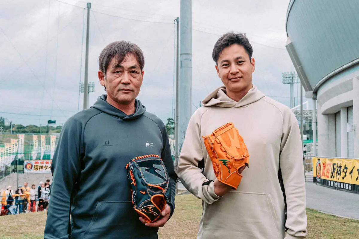 グラブを手にするアイピーセレクト・鈴木一平氏(左)と大竹(提供写真)