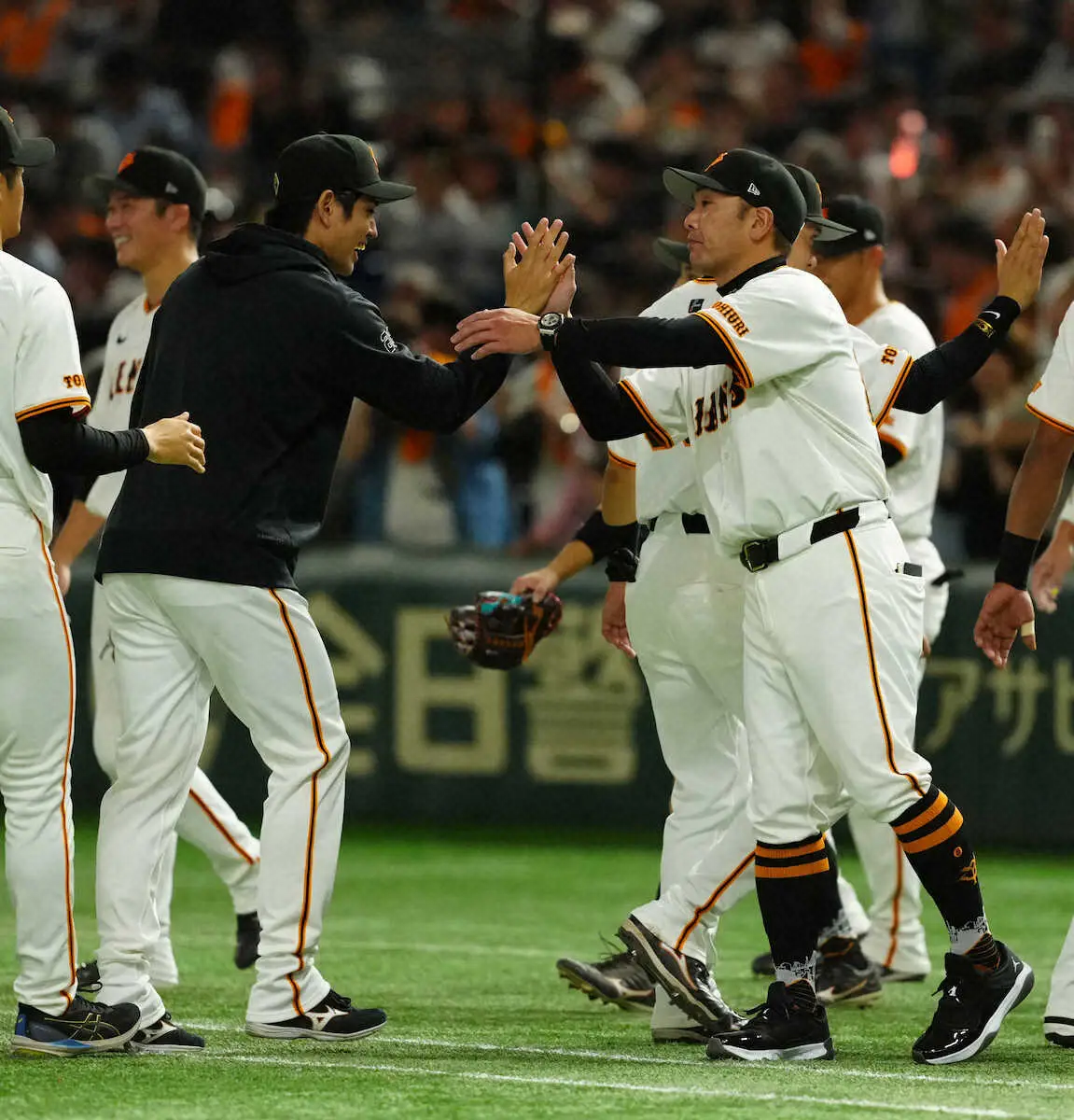 <巨・D>高橋礼(左)とハイタッチする阿部監督(撮影・島崎忠彦)