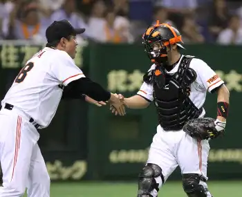 2008年9月24日広島戦でプロ初完投した巨人先発・東野(右)と打のヒーロー木村拓也。前日登板した先発勝利は82年5月4日の西本聖以来、26年ぶりの快挙。巨人は1引き分けを挟み、32年ぶりの12連勝を達成