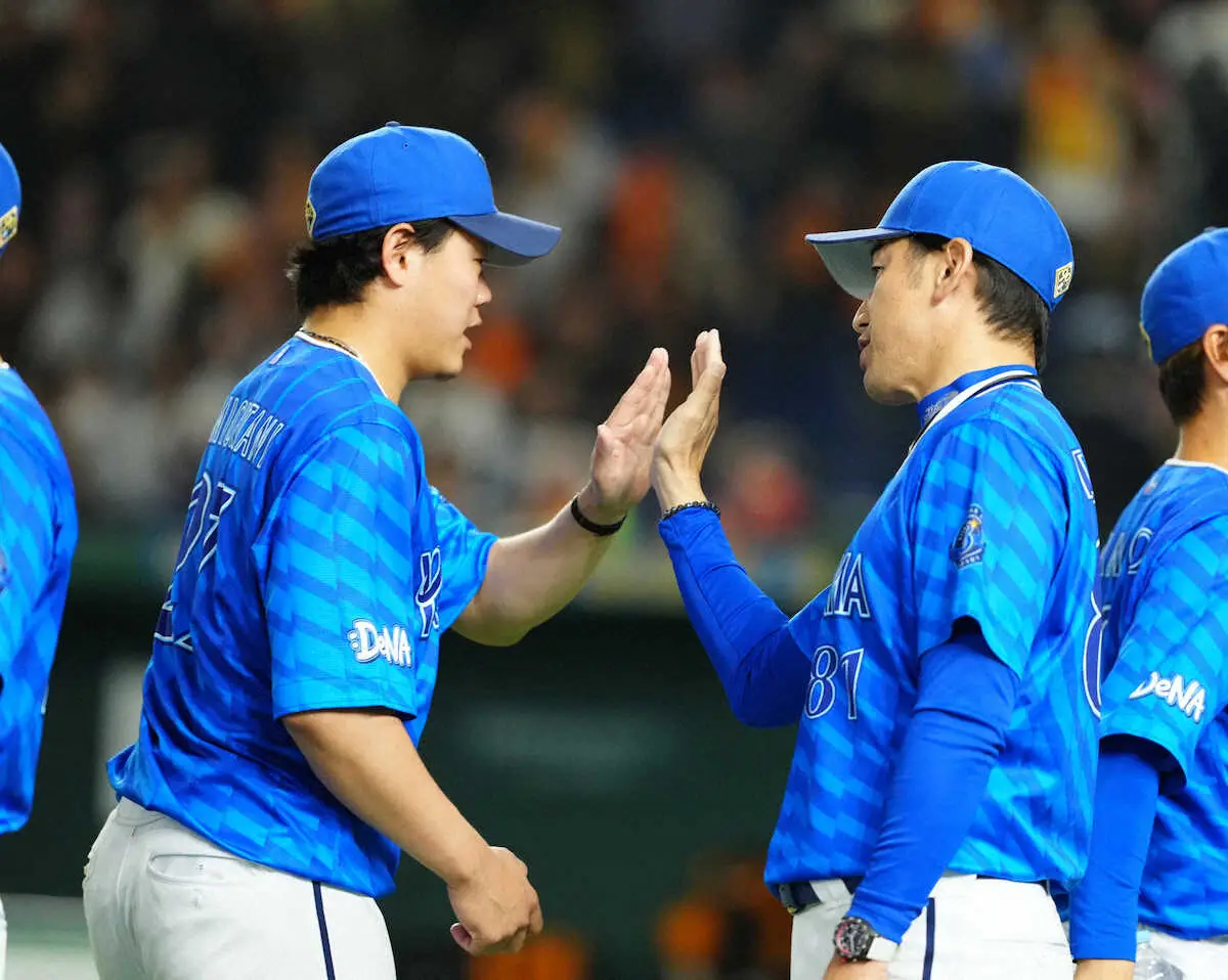 <巨・D>勝利し上茶谷(左)とハイタッチする三浦監督(撮影・島崎忠彦)