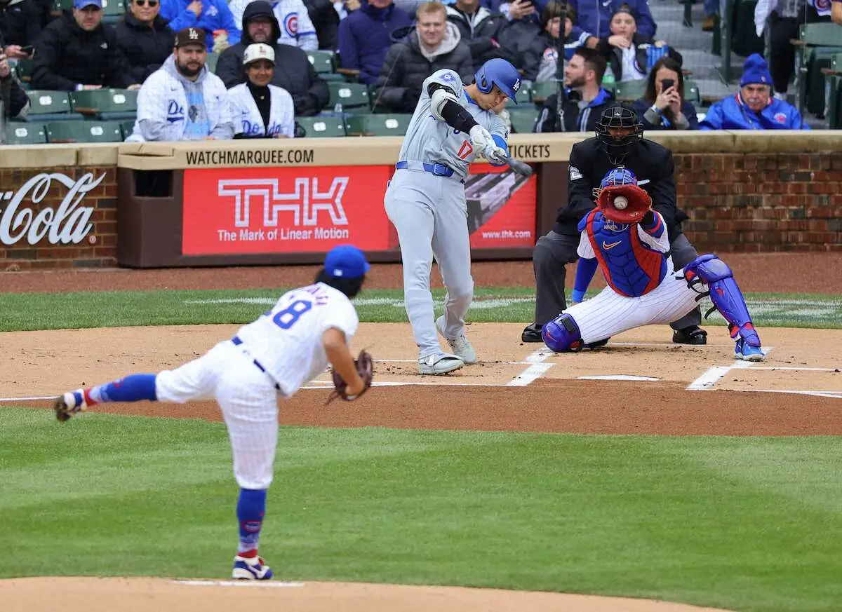 ドジャースの大谷翔平投手(29)が7日(日本時間8日)、敵地でのカブス戦に「2番・DH」で先発出場。カブス先発・今永昇太投手(30)と日米通じて初対決となった第1打席は空振り三振だった。