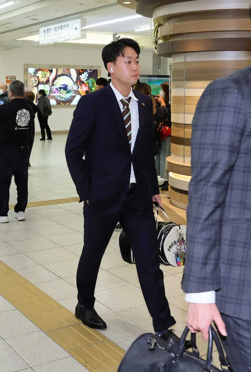 鹿児島空港に到着した山崎伊(撮影・尾崎 有希)