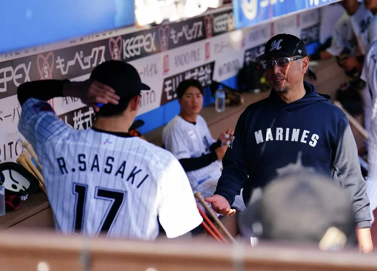 ベンチで降板した佐々木朗をねぎらうロッテ・吉井監督