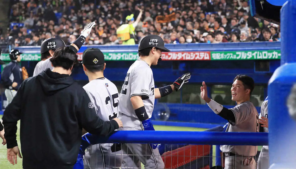 <ヤ・巨>6回、先制適時打の小林(中央)を祝福する巨人ナイン (撮影・西川祐介)