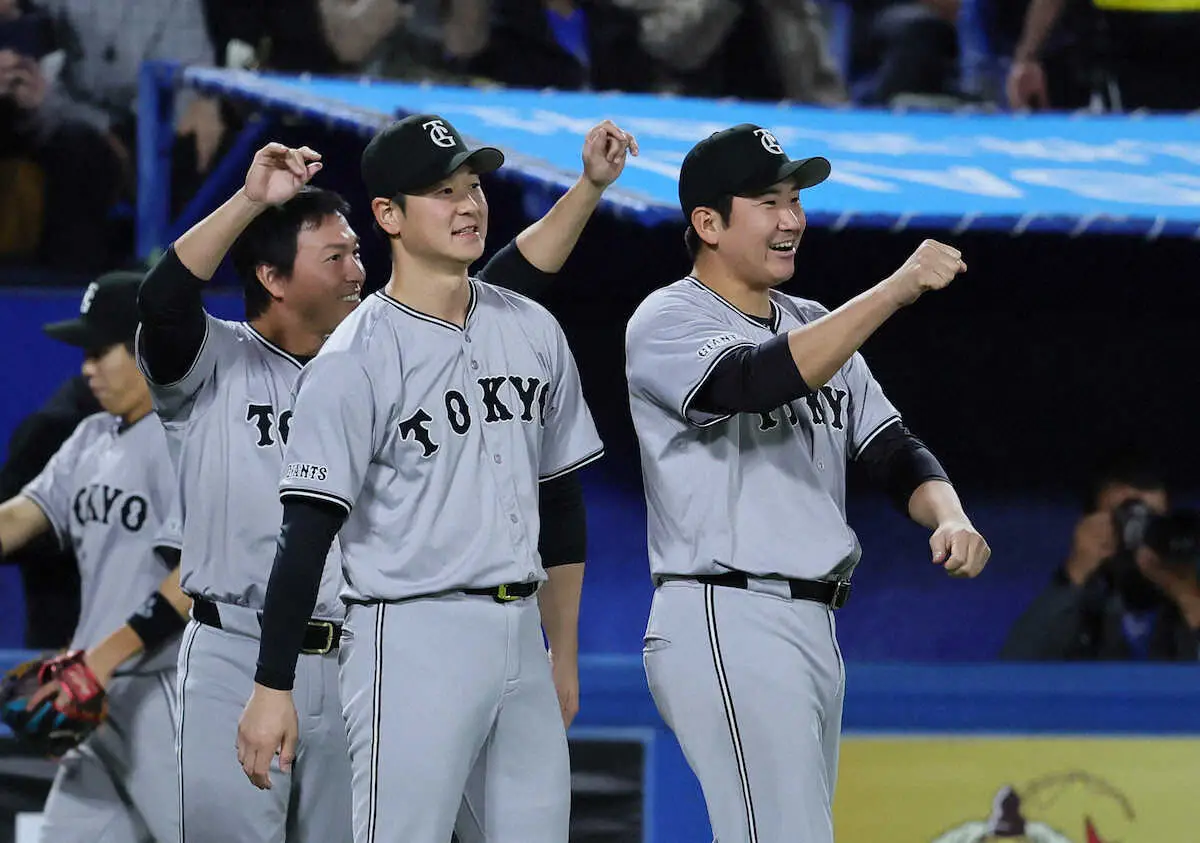 <ヤ・巨>7回途中から登板し無失点で切り抜けたバルドナードを笑顔で出迎える菅野(右)ら(撮影・尾崎 有希)