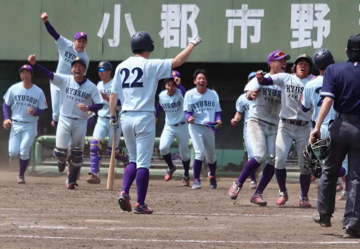 第1試合で西南大と対戦した九国大は、5―5の同点で突入した延長タイブレークの10回裏1死二、三塁に、相手のワイルドピッチで6―5のサヨナラ勝ち。1回戦(2―9で敗戦)の雪辱を果たした。