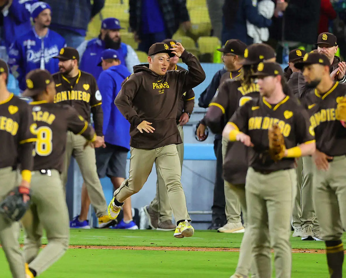 <ドジャース・パドレス>勝利投手となり、遅れてタッチの列に加わるパドレス・松井(撮影・光山 貴大)