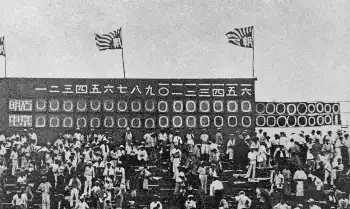 スコアボードは甲子園球場完成翌年の1925(大正14)年3月、木造の得点板を右中間席後方に設けたのが始まり。「スコアボールド」と呼んだ。33年夏の全国中等学校優勝野球大会(今の選手権大会)で、中京商―明石中が延長25回を繰り広げた際には、はしごを横にして急場をしのぎ、最後は作業委員が「0」の板を掲げた。