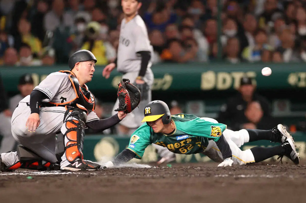 1死二、三塁となって代打・糸原健斗の当たりはライナー性の浅い右飛だった。植田は「当たりゴー」のギャンブルスタートでかなり離塁していたが帰塁し、敢然と本塁に突っ込んだ。打球が右中間寄りで右翼手の体勢が悪いと判断していた。