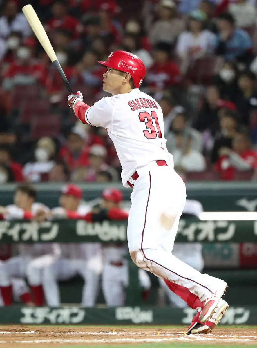 堂林の押し出し四球で先制し、なおも無死満塁の初回。内角低めスライダーを右前へはじき返して2点目を挙げると、2点優勢の3回には2死から3試合ぶりの2号ソロ。甘く入った150キロを右中間席へ運び、一挙5点攻撃の口火を切った。