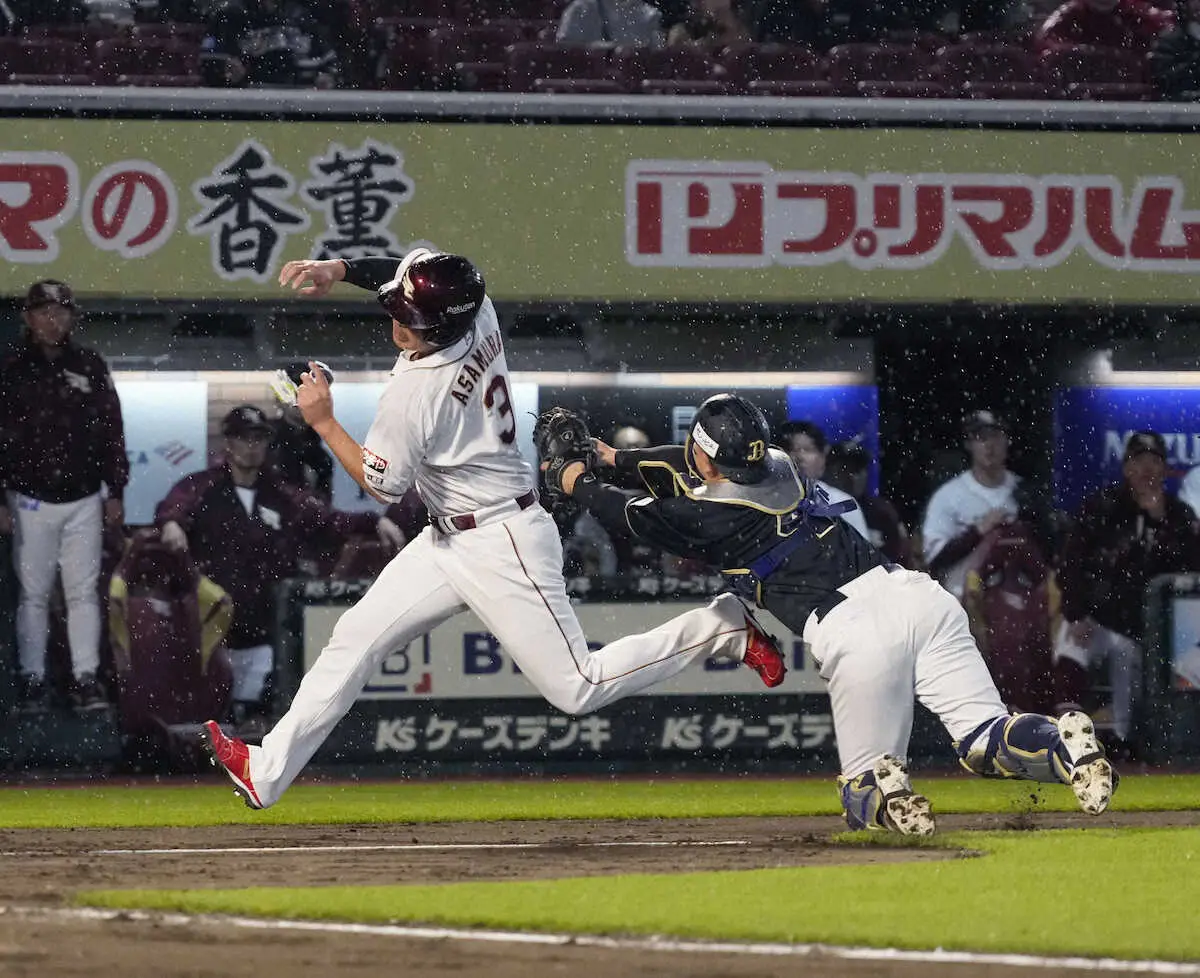 自身の2点二塁打で同点に追いついた初回だ。1死三塁で、阿部の三ゴロで三塁走者の浅村がスタートを切った。高いバウンド。難しい判断だったが「暴投があるかなと思いながら走った」。いったんは三本間で止まったものの、三塁手・西野の本塁返球が一塁寄りに大きくそれ、再び本塁へ。捕球した捕手・森のタッチに体を反らし、本塁を陥れた。