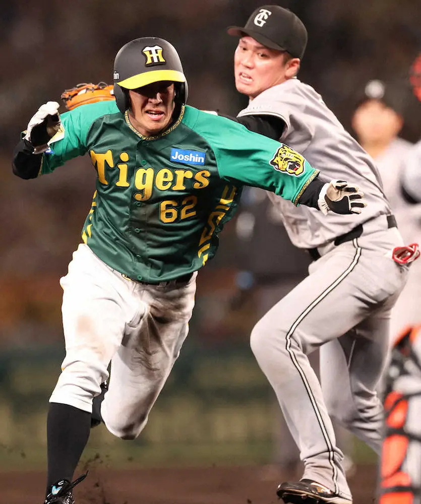 <神・巨>7回、坂本(右)のタッチをかいくぐり三進する植田(撮影・平嶋 理子)