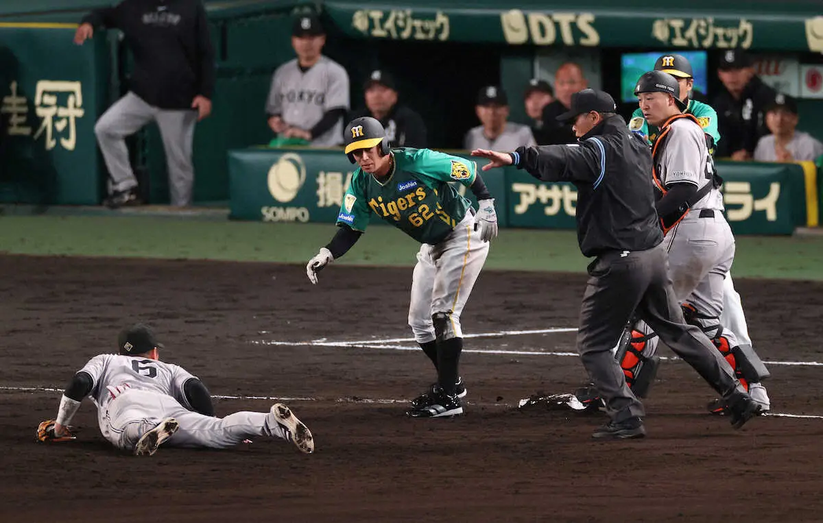 二兎(にと)を追ったが、一兎も得られず。紙一重のプレーは、結果的に手痛いミスになった。昨季3勝10敗と大きく負け越した鬼門・甲子園での初戦。延長10回に突入した直後、降雨コールドで今季初のドローとなり、首位・中日とは0.5ゲーム差となった。(川島 毅洋)