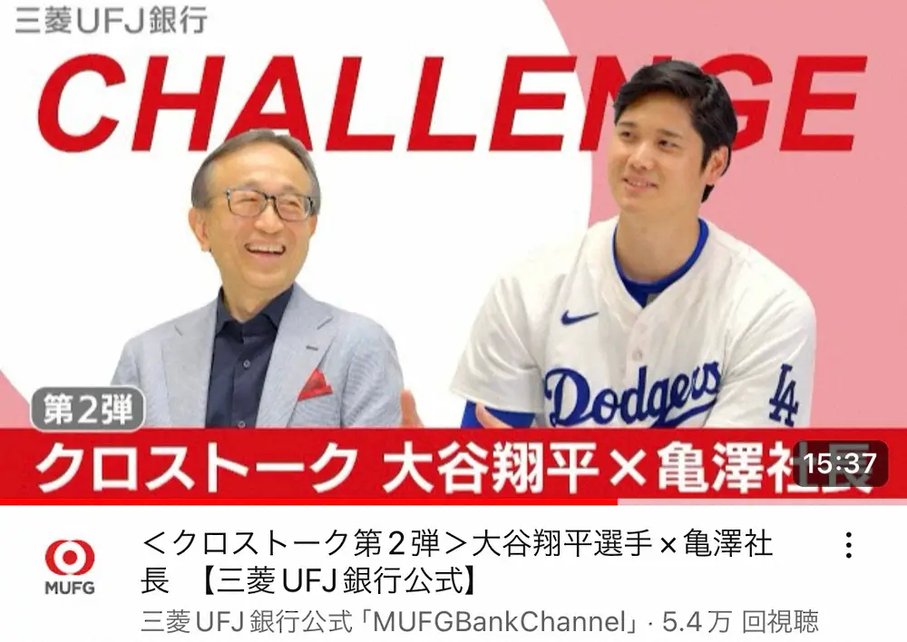 三菱UFJ銀行のYouTubeチャンネルが18日までに更新され、同行と「ブランドパートナー」契約を結ぶドジャース・大谷翔平投手(29)が登場した。