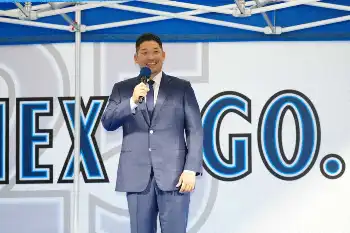 異例の公開会見。スタンドが無料開放され、集結したファンが見守る中で会見した。応援歌がスタジアムに響く中、スーツ姿の筒香が登場すると、大歓声が巻き起こった。