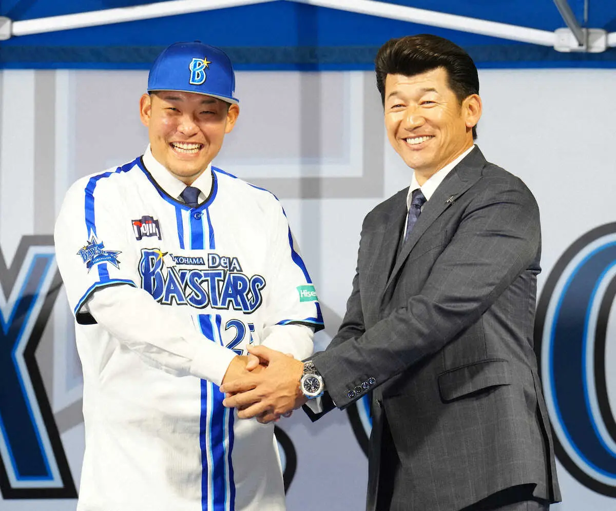 そして、会見途中には三浦監督がサプライズ登場。「おかえり!」と声を掛けられ笑顔がはじけた。三浦監督からは、雨の会見となったことを謝罪され、筒香だけでなくスタジアムは大爆笑。その後、指揮官から背番25のユニホームを着せられ、気持ちを新たにしていた。