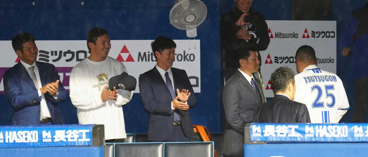 質疑応答後、サプライズゲストとして三浦大輔監督がスーツ姿で登場。「おかえり!」と声をかけ、ガッチリと握手。三浦監督とは復帰までのやりとりや期待などを語った。