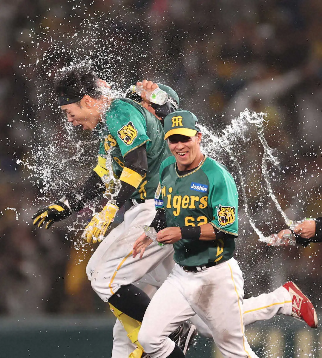 <神・巨>10回無死満塁、サヨナラ打を放ち、ウオーターシャワーを浴びる佐藤輝(左)(撮影・北條 貴史)