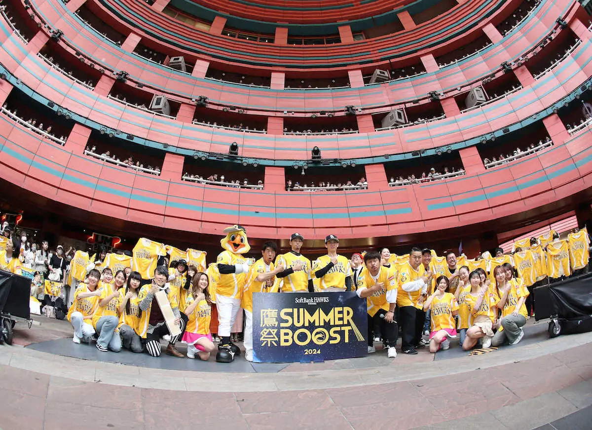 ソフトバンクは19日、福岡市博多区のキャナルシティ博多で今季から新たに生まれ変わる「鷹の祭典」の発表イベントを開催。2006年に始まった「鷹の祭典」の名称を「鷹祭 SUMMER BOOST」に変更し、ペイペイドームで6試合(7月26~28日のオリックス戦、8月2~4日の日本ハム戦)行うと発表した。野球はもちろん、音楽やお笑いなど日替わりで多彩なエンターテイナーが登場。また、ペイペイドームだけではなく、福岡市内の各所でもイベントが行われる。