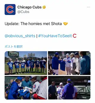 きっかけは7日(日本時間8日)に本拠地で行われたドジャース戦だった。今永は先発登板し、気温9度の寒さで雨もパラつく中、半袖で力投したが、雨天中断を経て降板となった。その試合を話題を集めたのが、右翼席最前列に陣取った6人のファン。上半身裸で「S」「H」「O」「T」「A」「!」と1文字ずつボディーペイントをして、熱烈応援。これに今永が反応し、Tシャツのプレゼントを計画していた。