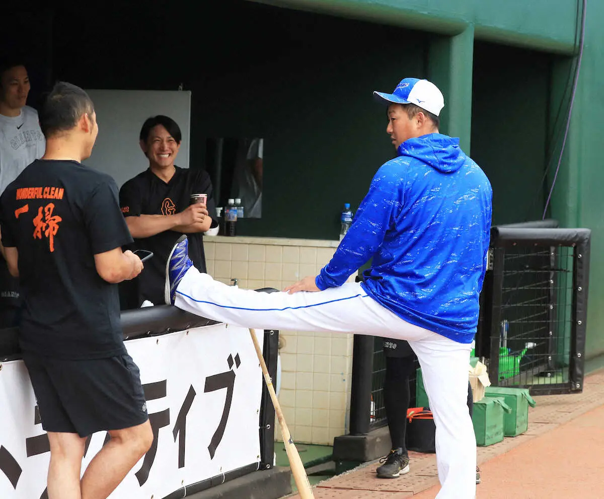 <巨・中>試合前に小林(左奥)ら巨人ナインと談笑する中田 (撮影・西川祐介)