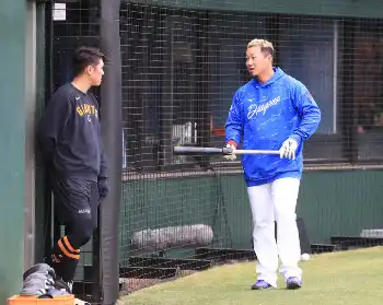 <巨・中>試合前に談笑する坂本(左)と中田 (撮影・西川祐介)