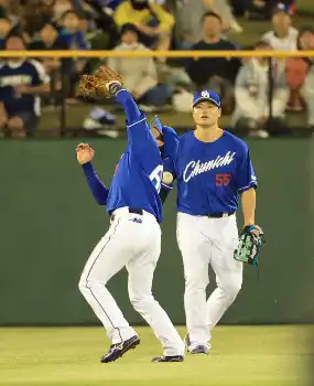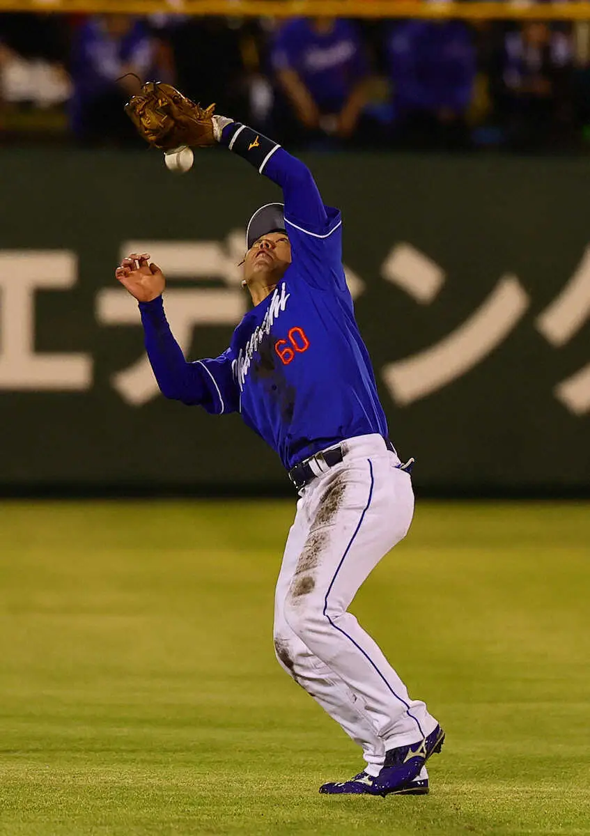 <巨・中>4回、岡本和のフライを落球する山本(撮影・藤山 由理)
