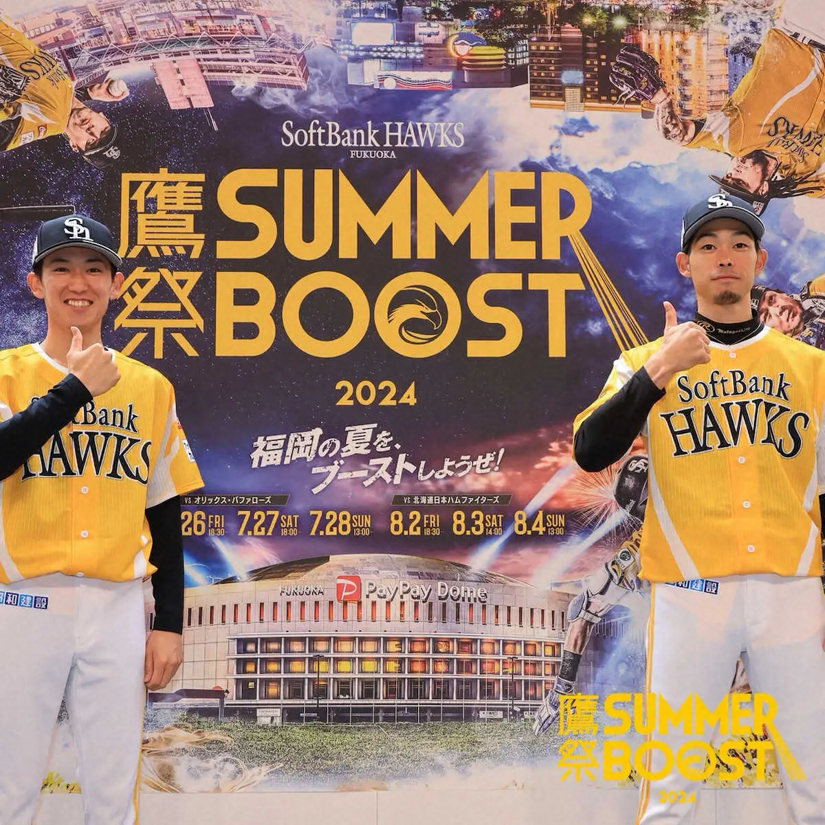 キャナルシティ博多からペイペイドームに“直行”し、登板しました。19日のオリックス戦前に「鷹の祭典」の名称変更イベントに大津とゲストとして出演しました。本拠地で今夏6試合組まれる恒例イベントは「鷹祭 SUMMER BOOST」です。ブーストっていう響きに、雰囲気や勢いを感じますし、キャナルシティのお客さんも多かった。良かったですよ。