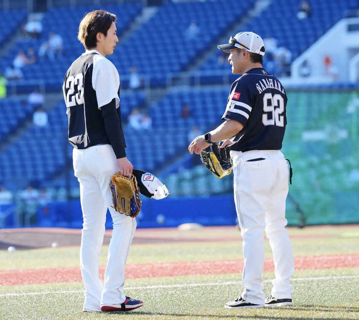 <ロ・ソ>合流した周東は守備練習中のウォーカーとハグ(撮影・長久保 豊) Photo by スポニチ 家庭の事情で離脱していたソフトバンク周東がロッテ戦前練習から1軍再合流 ギャラリーで見る この記事のフォト 2024年04月25日の画像一覧 もっと見る 2024年04月25日の画像をもっと見る