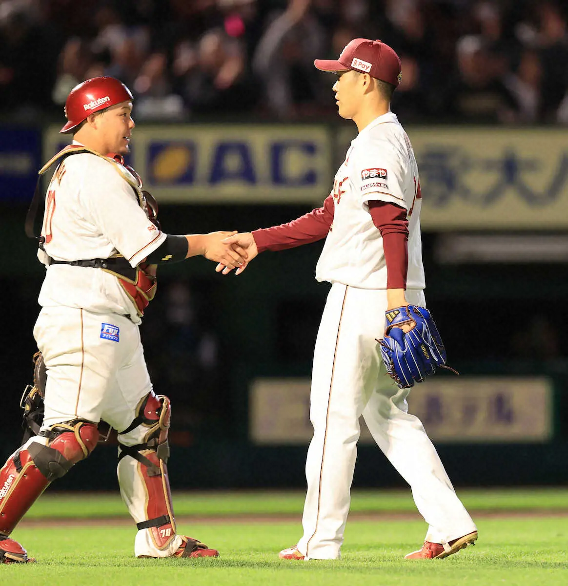 最後は気迫でねじ伏せた。9回2死満塁。楽天・則本は松本剛をフォークで左飛に打ち取り、安堵(あんど)の表情で捕手の石原と握手を交わした。
