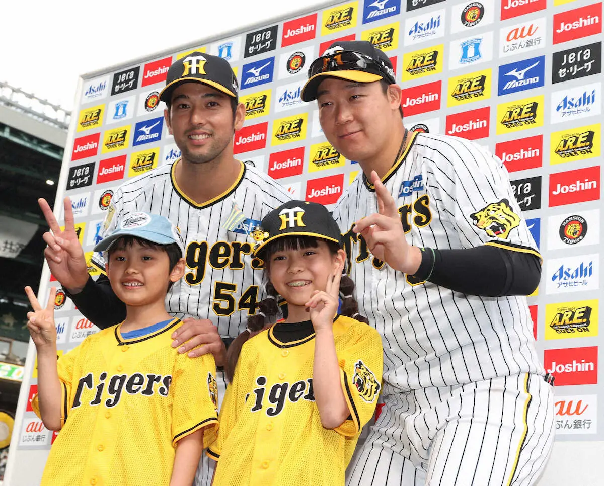 <神・ヤ> お立ち台で子どもたちとともに笑顔を見せる阪神・大山(右)と加治屋(撮影・大森 寛明)